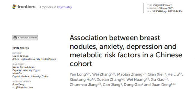 Front Psychiatry发布:中国人群中患有焦虑和抑郁的女性患乳腺结节的风险更高