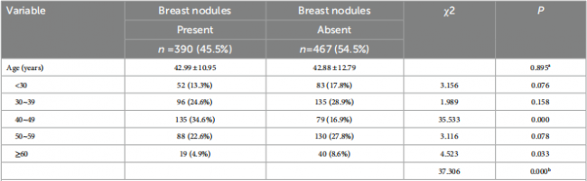 857名女性中,390名妇女(45.5%)被发现有乳腺结节,467名妇女(55.5%)没有乳腺结节。乳腺结节和对照组在平均年龄、身高、体重和身体质量指数方面没有显著差异。但是年龄分布的差异具有统计学意义(p < 0.001)。年龄在40~49岁之间的乳腺结节的组成为34.6%,明显高于其他年龄段的女性。40-49岁乳腺结节组的比例明显高于无乳腺结节组(34.6% vs. 16.9%,p<0.001)。绝经后妇女的乳腺结节明显低于绝经前妇女(26.4% vs. 73.6%,p= 0.026)。