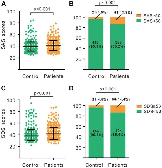 乳腺结节患者和对照组的SAS评分。(B)乳腺结节患者和对照组中不同SAS评分的受试者组成。乳腺结节患者和对照组的(C) SDS评分。(D)乳腺结节患者和对照组中不同SDS评分的受试者组成。(A,C)Wilcoxon-MannWhitneyu检验。(B、D)卡方检验。SAS,自评焦虑量表;SDS,自评抑郁量表。