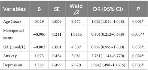 为探讨乳腺结节的影响因素,分别纳入年龄、焦虑、抑郁、绝经状态、血清尿酸变量进行回归分析。在该模型中,年龄的OR为1.03(95% CI 1.01–1.05,p=0.002),绝经状态为0.40(95% CI 0.25–0.65,p<0.001),UA为1.00(95% CI 0.99–1.00,p=0.038),以及有乳腺结节的女性。患有乳腺结节的女性的焦虑和抑郁之间有显著相关性(OR=2.78,95% CI 1.14–6.77,p=0.024;OR=3.98,95% CI 1.50–10.60,p=0.006;表2)